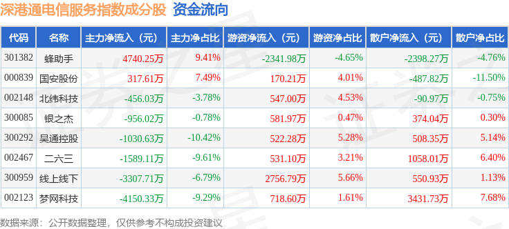资金流向方面,深港通电信服务(983057)指数成份股当日主力资金净流出合计6431.97万元,游资资金净流入合计3485.97万元,散户资金净流入合计2946.01万元。成份股资金流向详情见下表:
