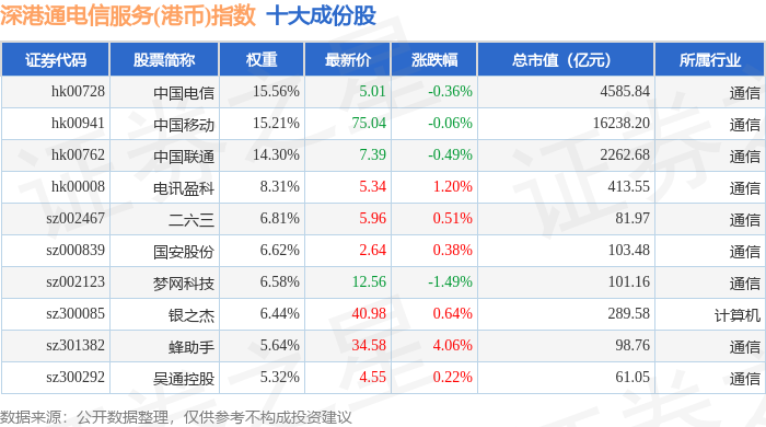 深港通电信服务(港币)(983058)指数十大成份股详情如下:
