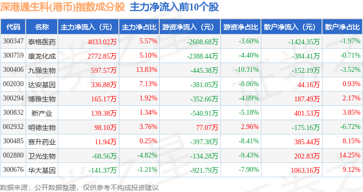 资金流向方面,深港通生科(港币)(983060)指数成份股当日主力资金净流出合计1.83亿元,游资资金净流出合计4727.98万元,散户资金净流入合计2.3亿元。成份股资金流向详情见下表: