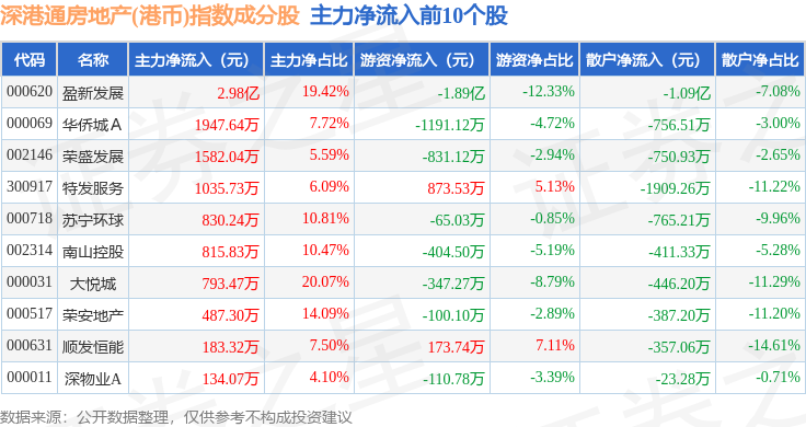 资金流向方面,深港通房地产(港币)(983072)指数成份股当日主力资金净流出合计1.56亿元,游资资金净流出合计1737.99万元,散户资金净流入合计1.74亿元。成份股资金流向详情见下表: