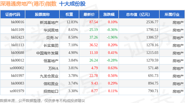 深港通房地产(港币)(983072)指数十大成份股详情如下: