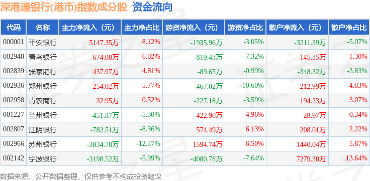 资金流向方面,深港通银行(港币)(983082)指数成份股当日主力资金净流出合计921.31万元,游资资金净流出合计5027.88万元,散户资金净流入合计5949.19万元。成份股资金流向详情见下表: