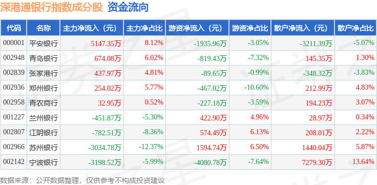 资金流向方面,深港通银行(983081)指数成份股当日主力资金净流出合计921.31万元,游资资金净流出合计5027.88万元,散户资金净流入合计5949.19万元。成份股资金流向详情见下表: