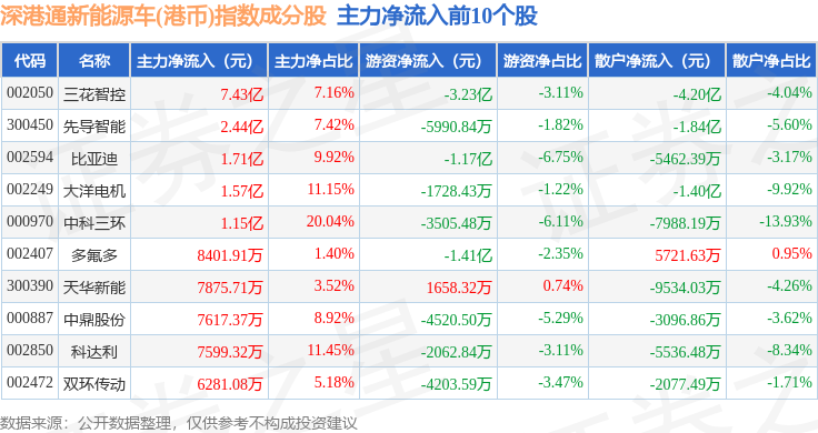 资金流向方面,深港通新能源车(港币)(983088)指数成份股当日主力资金净流出合计5.56亿元,游资资金净流出合计6.95亿元,散户资金净流入合计12.5亿元。成份股资金流向详情见下表:
