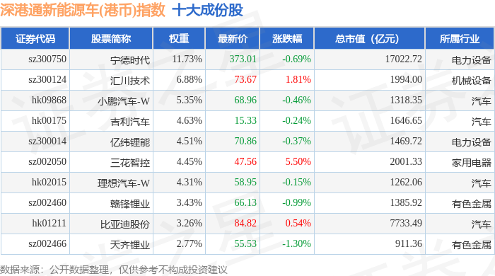 深港通新能源车(港币)(983088)指数十大成份股详情如下: