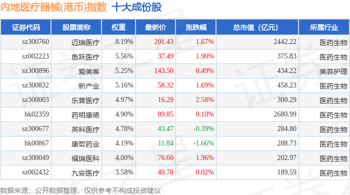 内地医疗器械(港币)(983104)指数十大成份股详情如下: