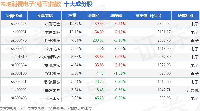 内地消费电子(港币)(983106)指数十大成份股详情如下: