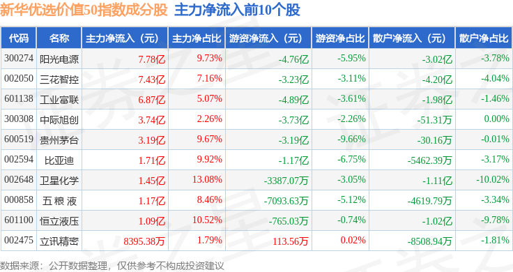 资金流向方面,新华优选价值50(989004)指数成份股当日主力资金净流出合计9.35亿元,游资资金净流出合计5.38亿元,散户资金净流入合计14.73亿元。成份股资金流向详情见下表: