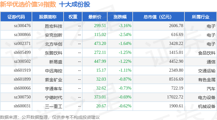 新华优选价值50(989004)指数十大成份股详情如下: