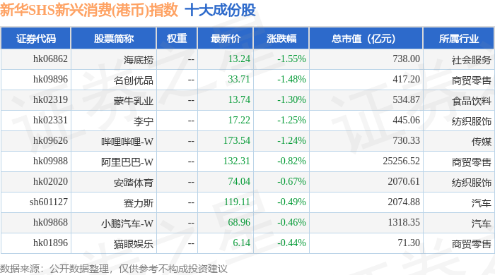 新华SHS新兴消费(港币)(989007)指数十大成份股详情如下: