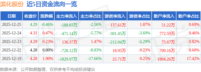 证券之星消息,截至2025年12月25日收盘,滨化股份(601678)报收于4.29元,下跌0.46%,换手率0.84%,成交量17.17万手,成交额7376.53万元。