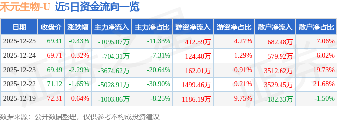 证券之星消息,截至2025年12月25日收盘,禾元生物(688765)报收于69.41元,下跌0.43%,换手率3.4%,成交量1.39万手,成交额9665.46万元。