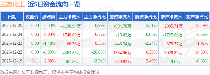 证券之星消息,截至2025年12月25日收盘,三友化工(600409)报收于6.03元,下跌0.33%,换手率1.36%,成交量28.11万手,成交额1.7亿元。