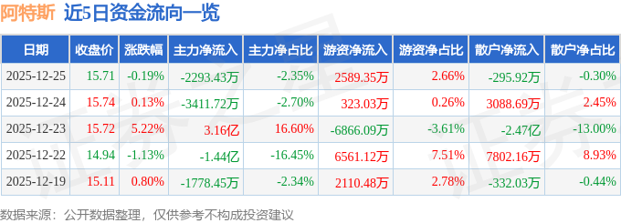 证券之星消息,截至2025年12月25日收盘,阿特斯(688472)报收于15.71元,下跌0.19%,换手率4.66%,成交量62.77万手,成交额9.74亿元。