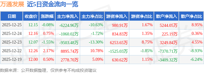 证券之星消息,截至2025年12月25日收盘,万通发展(600246)报收于12.15元,下跌0.08%,换手率2.54%,成交量48.11万手,成交额5.86亿元。