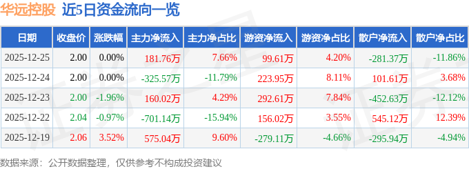 证券之星消息,截至2025年12月25日收盘,华远控股(600743)报收于2.0元,上涨0.0%,换手率0.5%,成交量11.8万手,成交额2372.62万元。