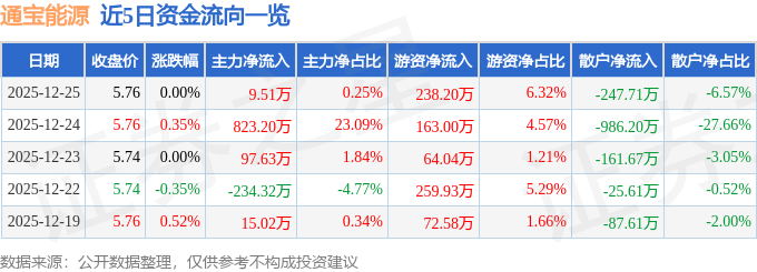 证券之星消息,截至2025年12月25日收盘,通宝能源(600780)报收于5.76元,上涨0.0%,换手率0.57%,成交量6.54万手,成交额3770.27万元。