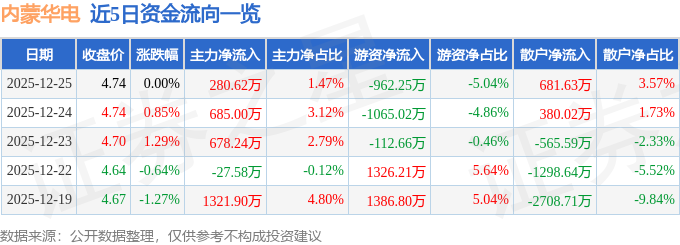 证券之星消息,截至2025年12月25日收盘,内蒙华电(600863)报收于4.74元,上涨0.0%,换手率0.61%,成交量40.02万手,成交额1.91亿元。
