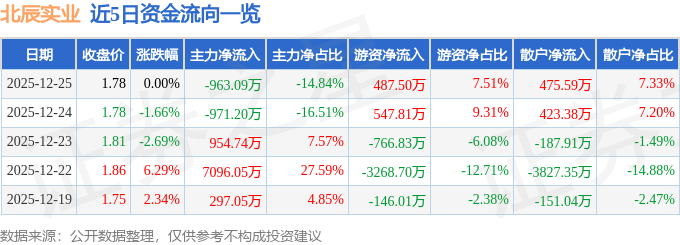 证券之星消息,截至2025年12月25日收盘,北辰实业(601588)报收于1.78元,上涨0.0%,换手率1.37%,成交量36.37万手,成交额6490.1万元。