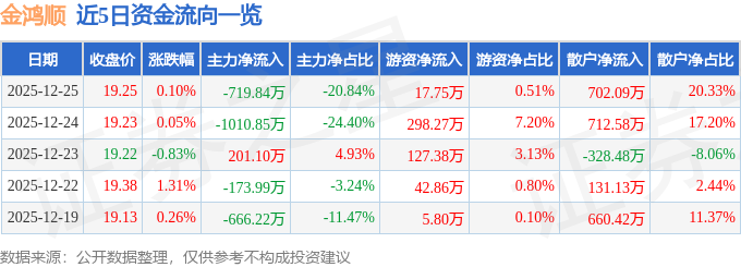 证券之星消息,截至2025年12月25日收盘,金鸿顺(603922)报收于19.25元,上涨0.1%,换手率1.0%,成交量1.8万手,成交额3453.63万元。