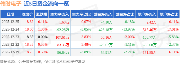 证券之星消息,截至2025年12月25日收盘,伟时电子(605218)报收于18.62元,上涨0.11%,换手率0.58%,成交量1.23万手,成交额2288.13万元。
