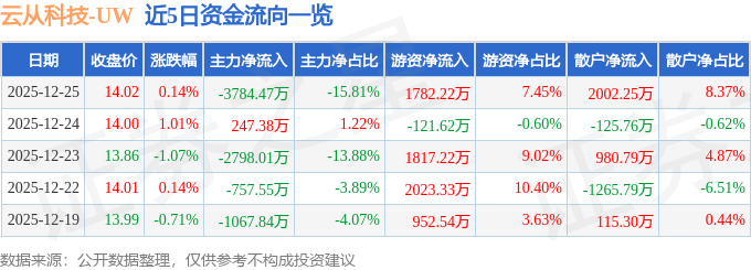 证券之星消息,截至2025年12月25日收盘,云从科技(688327)报收于14.02元,上涨0.14%,换手率2.06%,成交量17.14万手,成交额2.39亿元。