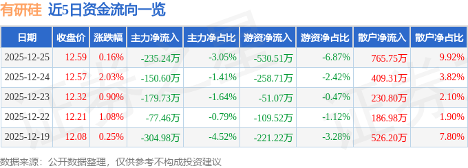 证券之星消息,截至2025年12月25日收盘,有研硅(688432)报收于12.59元,上涨0.16%,换手率0.49%,成交量6.15万手,成交额7722.75万元。