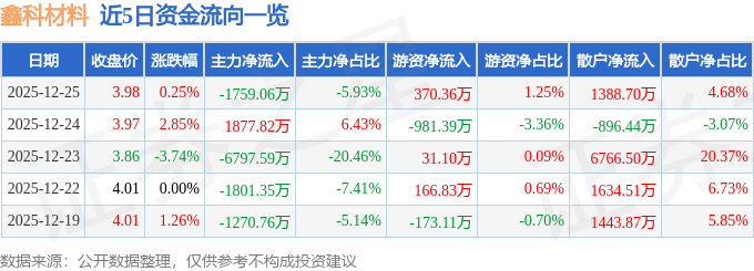 证券之星消息,截至2025年12月25日收盘,鑫科材料(600255)报收于3.98元,上涨0.25%,换手率4.17%,成交量75.3万手,成交额2.97亿元。