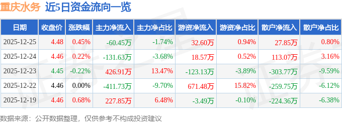 证券之星消息,截至2025年12月25日收盘,重庆水务(601158)报收于4.48元,上涨0.45%,换手率0.16%,成交量7.79万手,成交额3483.84万元。