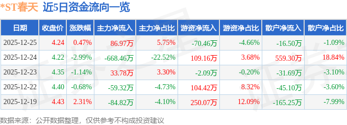 证券之星消息,截至2025年12月25日收盘,*ST春天(600381)报收于4.24元,上涨0.47%,换手率0.61%,成交量3.59万手,成交额1513.42万元。