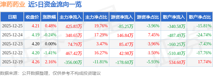 证券之星消息,截至2025年12月25日收盘,津药药业(600488)报收于4.21元,上涨0.48%,换手率0.47%,成交量5.11万手,成交额2154.51万元。