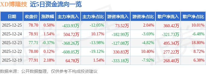 12月25日的资金流向数据方面,主力资金净流出433.93万元,占总成交额12.05%,游资资金净流入73.52万元,占总成交额2.04%,散户资金净流入360.42万元,占总成交额10.01%。