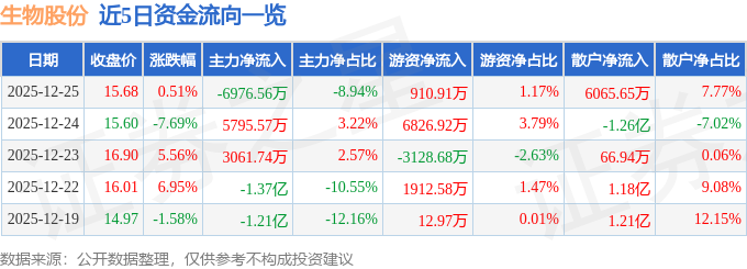 证券之星消息,截至2025年12月25日收盘,生物股份(600201)报收于15.68元,上涨0.51%,换手率4.51%,成交量50.18万手,成交额7.8亿元。
