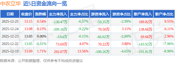 证券之星消息,截至2025年12月25日收盘,中农立华(603970)报收于13.15元,上涨0.54%,换手率0.56%,成交量1.51万手,成交额1987.02万元。
