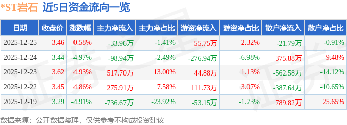 证券之星消息,截至2025年12月25日收盘,*ST岩石(600696)报收于3.46元,上涨0.58%,换手率2.07%,成交量6.94万手,成交额2406.58万元。