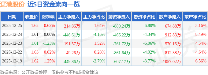 证券之星消息,截至2025年12月25日收盘,辽港股份(601880)报收于1.62元,上涨0.62%,换手率0.44%,成交量80.92万手,成交额1.31亿元。