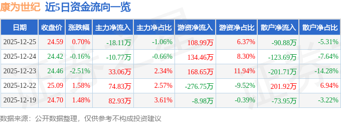 证券之星消息,截至2025年12月25日收盘,康为世纪(688426)报收于24.59元,上涨0.7%,换手率1.82%,成交量7003.0手,成交额1711.46万元。