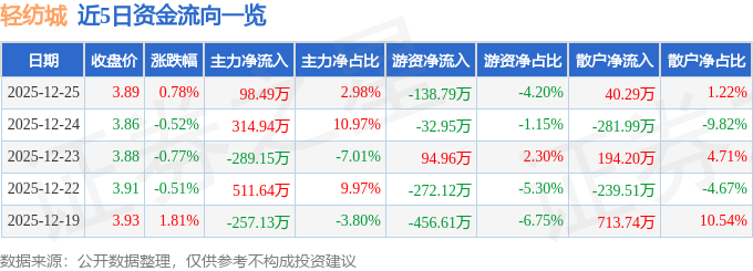 证券之星消息,截至2025年12月25日收盘,轻纺城(600790)报收于3.89元,上涨0.78%,换手率0.58%,成交量8.49万手,成交额3304.42万元。