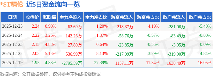 证券之星消息,截至2025年12月25日收盘,*ST精伦(600355)报收于2.24元,上涨0.9%,换手率4.73%,成交量23.29万手,成交额5206.92万元。
