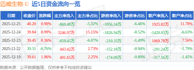 证券之星消息,截至2025年12月25日收盘,迈威生物(688062)报收于40.2元,上涨0.9%,换手率2.0%,成交量4.08万手,成交额1.64亿元。