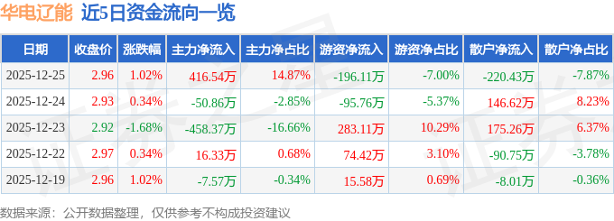 证券之星消息,截至2025年12月25日收盘,华电辽能(600396)报收于2.96元,上涨1.02%,换手率0.64%,成交量9.49万手,成交额2800.45万元。
