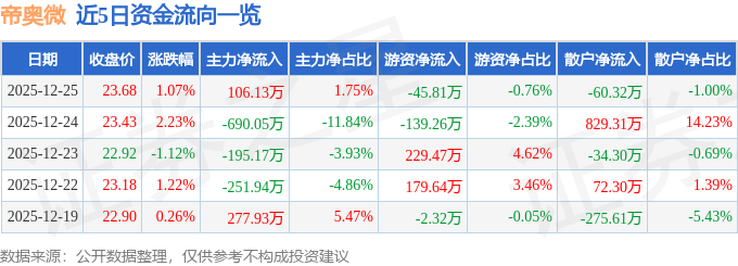 证券之星消息,截至2025年12月25日收盘,帝奥微(688381)报收于23.68元,上涨1.07%,换手率1.34%,成交量2.57万手,成交额6061.09万元。