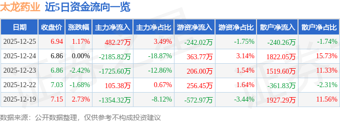 证券之星消息,截至2025年12月25日收盘,太龙药业(600222)报收于6.94元,上涨1.17%,换手率3.46%,成交量19.87万手,成交额1.38亿元。