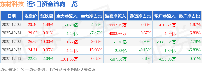 证券之星消息,截至2025年12月25日收盘,东材科技(601208)报收于29.46元,上涨1.48%,换手率12.67%,成交量128.99万手,成交额37.55亿元。