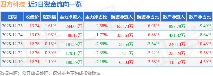 证券之星消息,截至2025年12月25日收盘,四方科技(603339)报收于13.24元,上涨1.61%,换手率2.3%,成交量7.11万手,成交额9462.15万元。