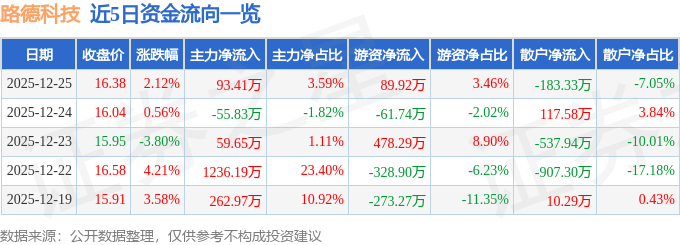 证券之星消息,截至2025年12月25日收盘,路德科技(688156)报收于16.38元,上涨2.12%,换手率1.6%,成交量1.61万手,成交额2599.01万元。