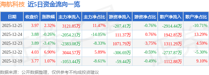 证券之星消息,截至2025年12月25日收盘,海航科技(600751)报收于3.97元,上涨2.32%,换手率2.68%,成交量68.87万手,成交额2.72亿元。