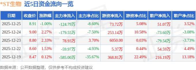 证券之星消息,截至2025年12月25日收盘,*ST生物(000504)报收于8.91元,下跌1.0%,换手率0.49%,成交量1.62万手,成交额1450.34万元。