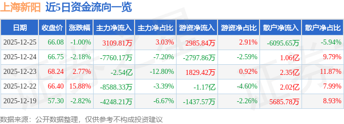 证券之星消息,截至2025年12月25日收盘,上海新阳(300236)报收于66.08元,下跌1.0%,换手率5.59%,成交量15.58万手,成交额10.26亿元。