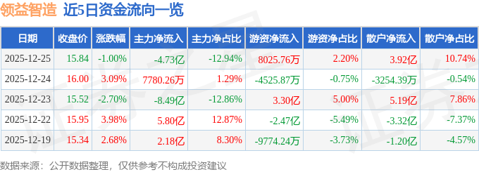 证券之星消息,截至2025年12月25日收盘,领益智造(002600)报收于15.84元,下跌1.0%,换手率3.21%,成交量230.94万手,成交额36.53亿元。